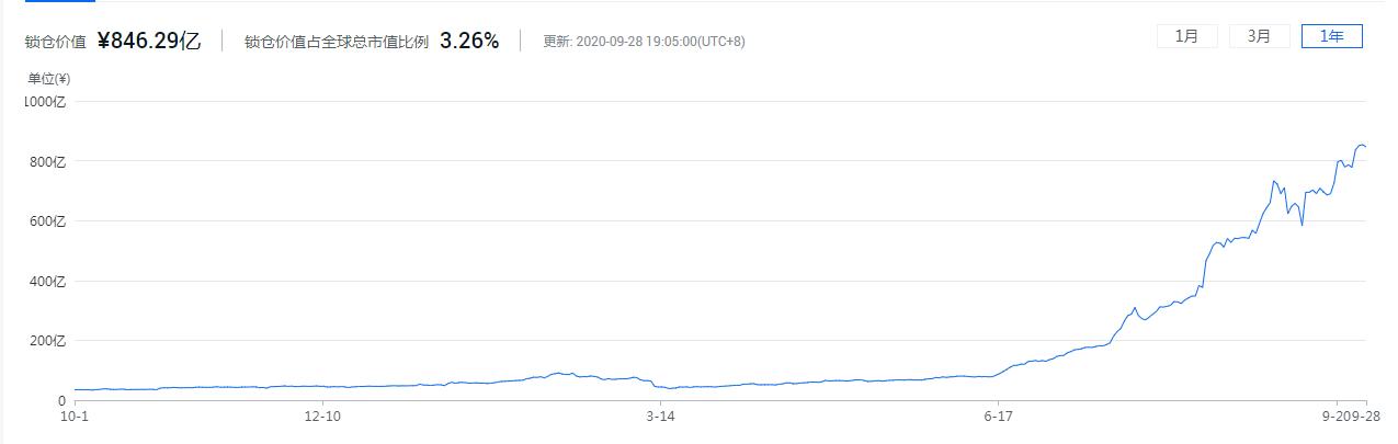 今年三月份的时候,整个Defi市场的锁仓总量不过30多亿人民币。但在经过半年时间的发展之后,目前Defi市场的锁仓总量已经超过了800亿人民币。锁仓总量在短短的半年时间里,增长了20多倍。