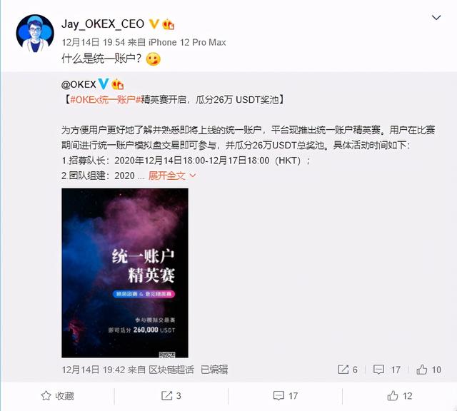 说了这么久的“统一账户团赛”,那么什么是“统一账户”呢?OKEx的CEO Jay Hao在微博上也卖了个关子。