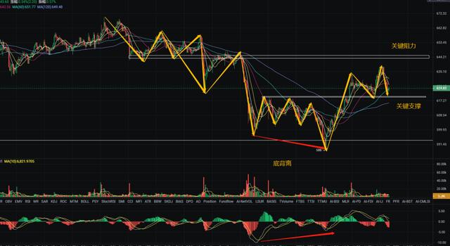 在保持连续的下跌趋势后,行情最终下探588后,完美形成底背离信号,出现大幅上涨走势,一举涨破过去的盘整区间带,很高抵达638附近,上扬幅度达到50U的空间,短期走势在关键支撑:620附近;关键阻力:640附近,区间内震荡,破位才有打开上行或者下行空间,不有效破位,则保持区间内高空低多。’
