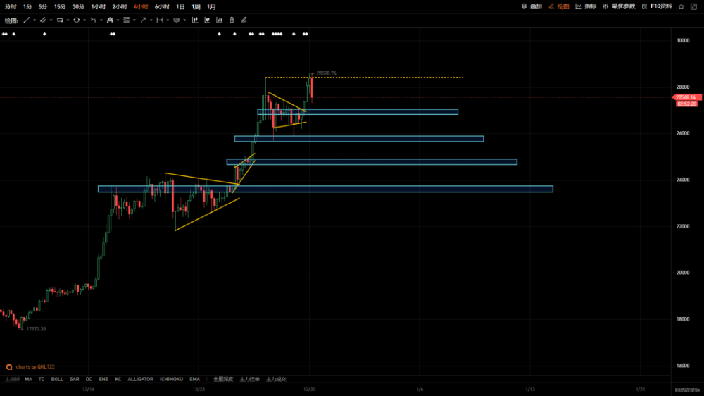 如图所示,币钻头在27000附近再次形成三角形收敛,并在上一份报告中提到的25700附近受到支撑。二探超买形成的前高压力位28422没有有效突破前高点,甚至没有站上28000点,但已经被用来补充上周的网上影子线价格。同时,二探确认短期压力位28500点,如果稳定在28000点,有继续上升的机会,中期底部偏空,仍在25700点和24700点左右观察到。