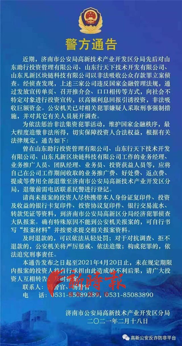 同时,投资者也自觉组织起来,陆续向济南市高新区地方金融监管局和公安局高新区分局举报,相关部门迅速介入睁开观察。今年2月18日,济南市公安局高新区分局公布警方通告,对三家投资公司以非法吸收民众存款罪立案侦查,其中包罗山东凡新区块链科技有限公司。经侦查发现,山东凡新区块链科技有限公司违反国家金融治理律例,通过发放宣**页、召开推介会、口口相传等方式,向社会不特定工具举行投资宣传,以高额利息回报引诱投资,非法吸收巨额资金。公安机关已对相关犯罪嫌疑人接纳刑事强制措施。警方通告中还呼吁,请尚未报案的投资人尽快携相关资推测济南市公安局高新区分局经济犯罪侦查大队报案。