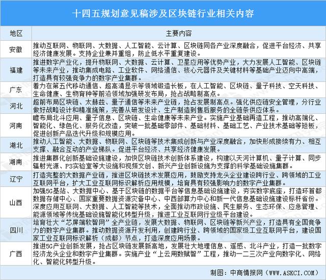 15省市十四五计划纲要提及区块链,要求建设统一区块链基础设施,在物流仓储、金融服务、产物溯源、都会治理、政务服务等领域开展创新应用。此外,区块链被11个省市写入十四五计划意见稿。