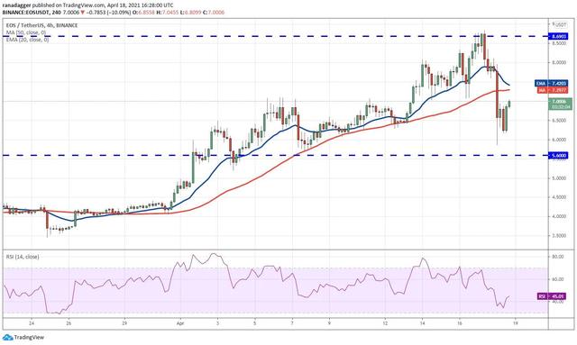 在4月17日多头未能将价格维持在8.7美元上方后,EOS**从上方阻力位下跌。大幅的抛售将价格拉低至5.8美元,略高于5.6美元的突破位。