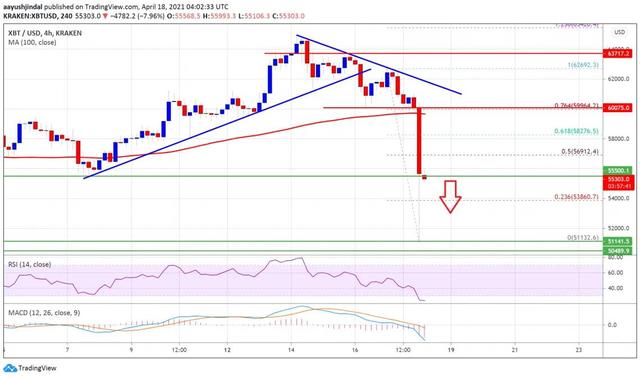 比特币突破了最近从62,692美元跌至51,132美元的23.6% Fib回撤位。现在,币价在55,500美元和56,000美元周围面临阻力。