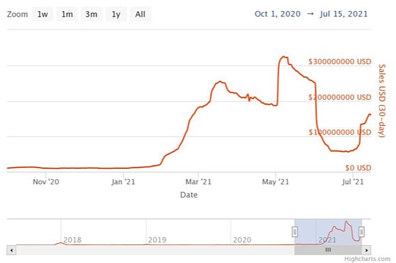 NFT在2021年5月之前呈现整体上升趋势。截至2021年5月7日,NFT在前30天的总交易额达到3.25亿美元。随后,市场下跌,并从6月份开始逐渐恢复。NFT市场的普及也推动了以太坊的普及。这两个市场的趋势非常相似。