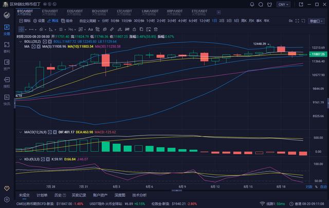 比特币自前天晚间一路暴涨打破上方压制涨至12448附近后开始震荡下行,昨日和今日走的都是震荡下行的走势,目前已经收回前天的所有涨幅,再次回到前面的震荡区间,虽然大趋势上仍然是多头走势,但是在高位盘整区间,我们谨防庄家和机构抛盘,诱多情绪会比较多,太过冒进踏错一步,很容易成为炮灰。