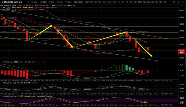 从形态来看,以太坊整体走一个完整的下降三角形整理,目前在下降趋势通道当中运行,空头趋势较为明朗,